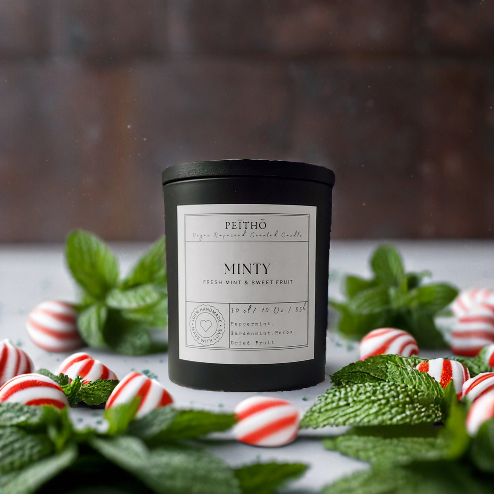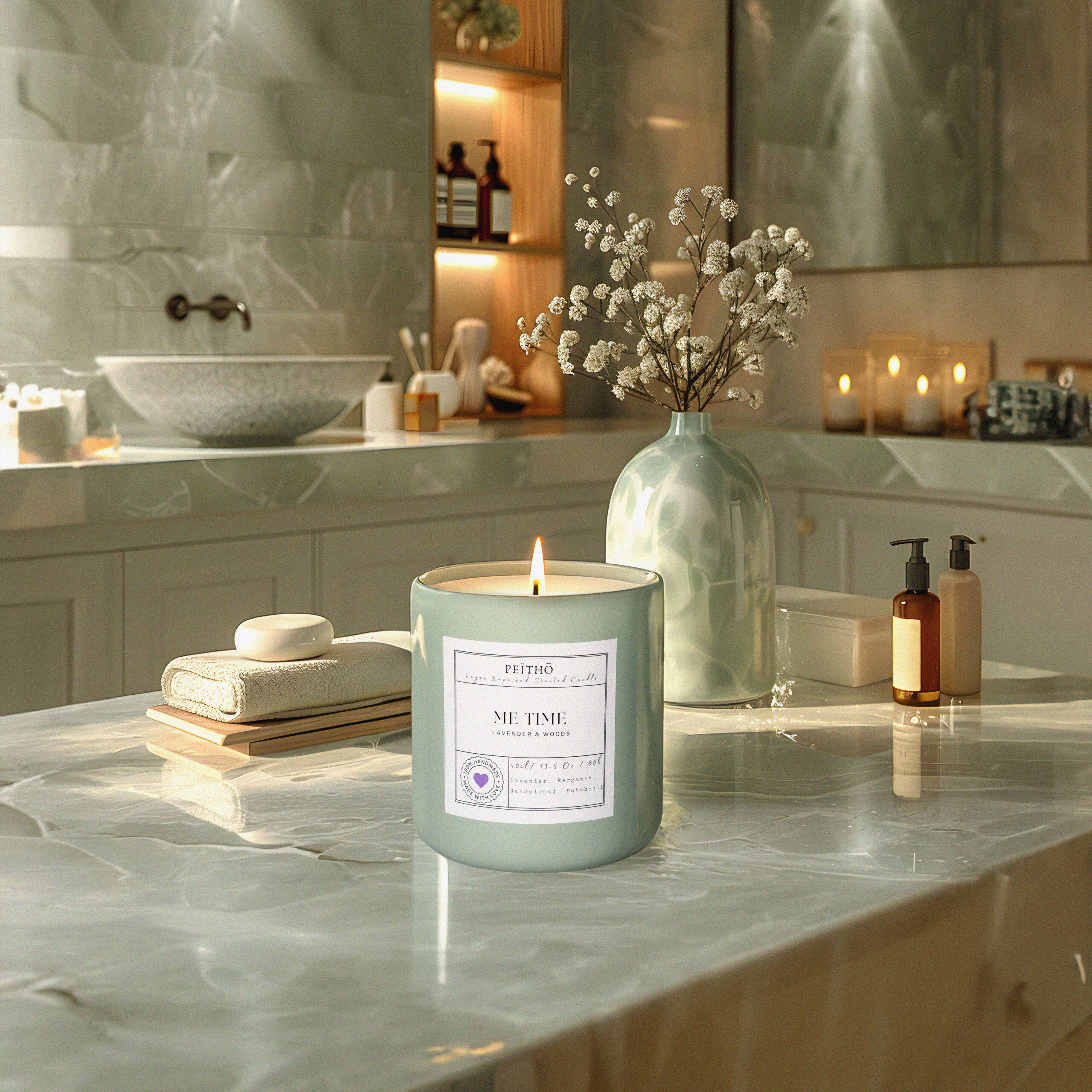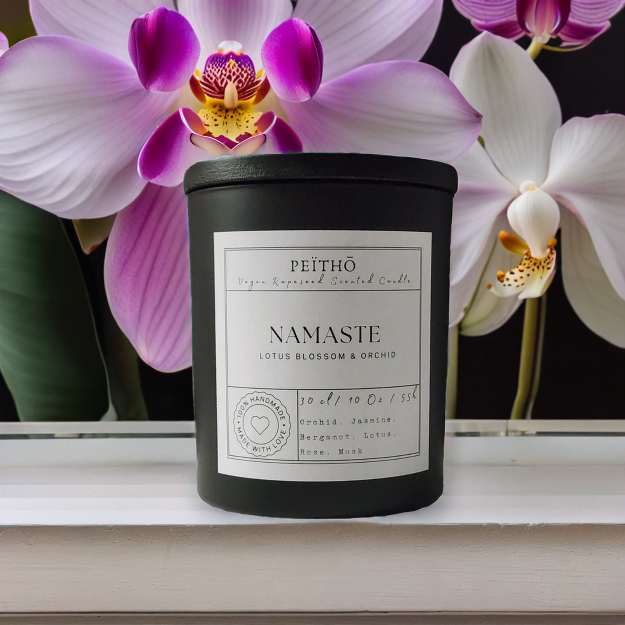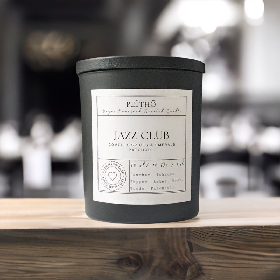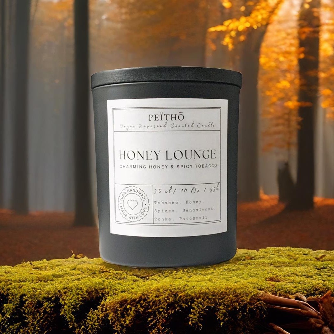 This is a luxury scented candle in a solid and heavy white ceramic-like glass candle jar. Its wooden lid helps to keep your precious scents for you. The ceramic pot is approx. 8cm in diameter and 9cm high. The candle is produced with a selected top-level European rapeseed wax that gives an optimal slow burn ratio. The is the larger Peïthō candle, carrying 30cl of wax and has proofed to have a long-lasting 55h burn-time.
